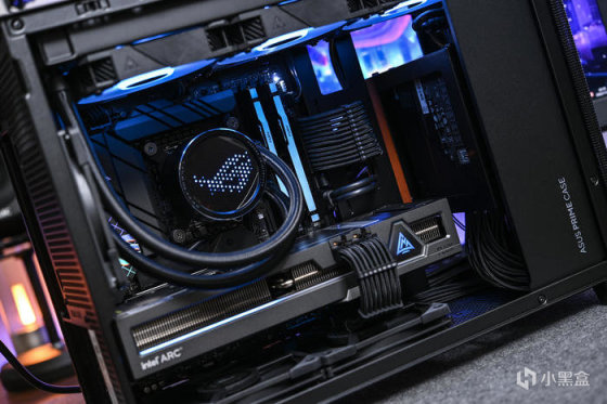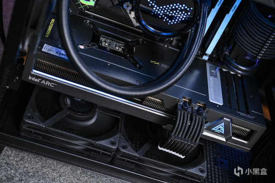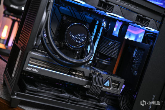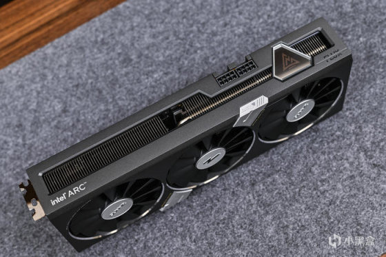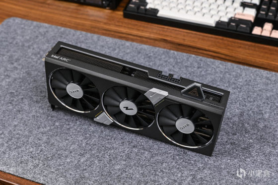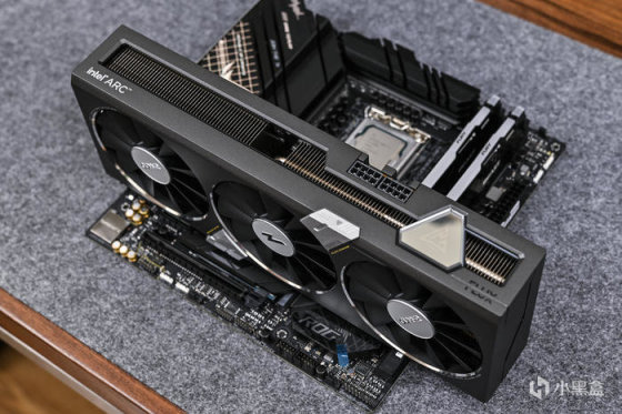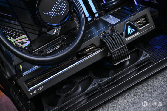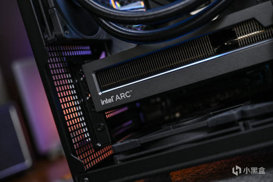 左侧印有 intel ARC 字样。下方的灯条可随功耗进行长度变换,科技感十足。