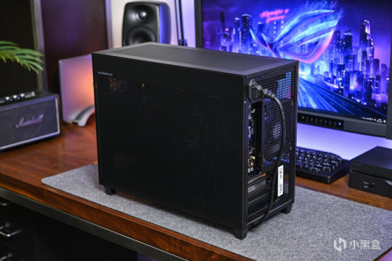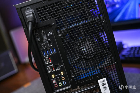 尾部左上角为电源插孔,中间左侧主板 I/O 接口,右侧 1 颗利民 Thermalright TL-B2 Extrem 风扇排风,