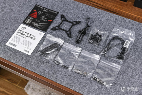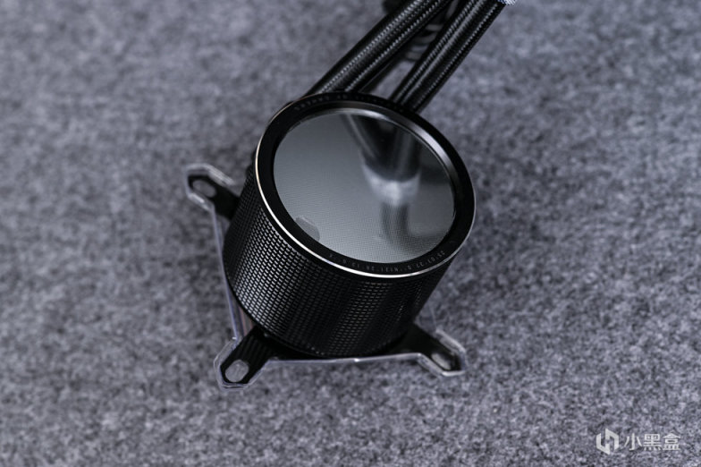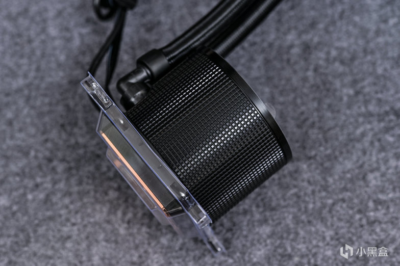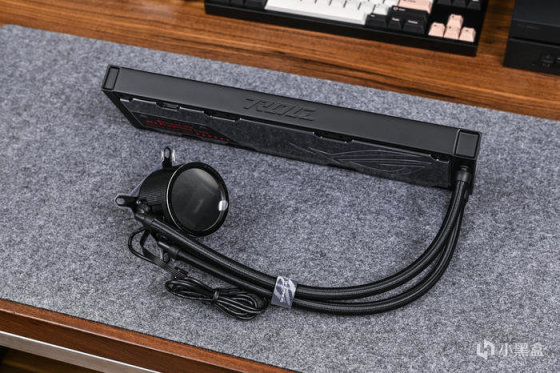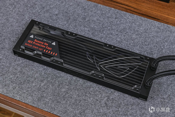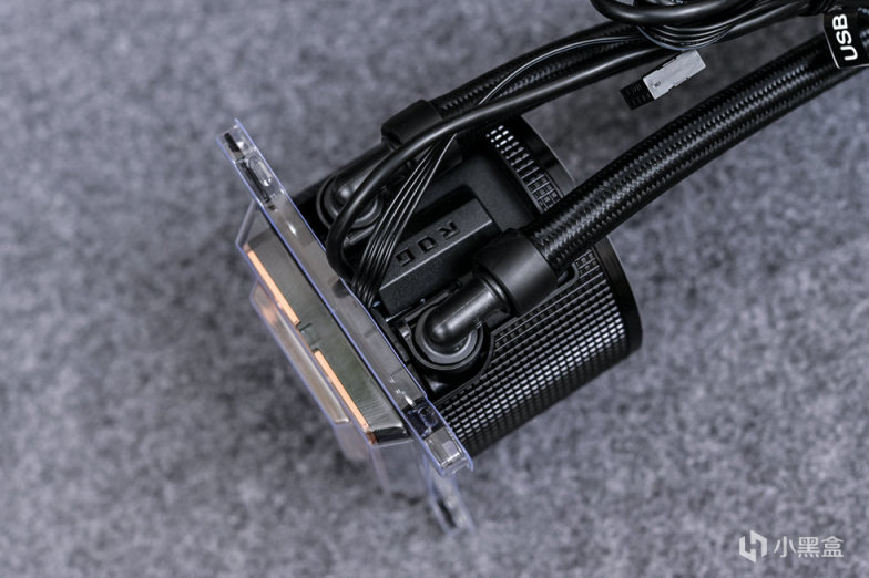 取出一体水冷本体。全黑化设计,重量还是蛮重的,黑色尼龙编织水管,接头包覆处材质为橡胶,自带印有ROG图案的魔术贴一个,可以起到水管理线的作用。这款冷排采用第八代 Asetek 水泵,更高流量、更低噪音、强化散热性能,搭配了大尺寸纯铜底板,同时预涂硅脂。