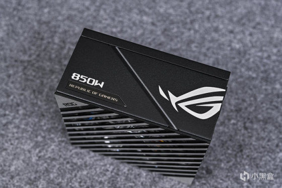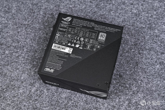 电源另一侧对称设计,左上角标注了电源型号及瓦数,斜纹相隔右下角则是ROG败家之眼Logo。