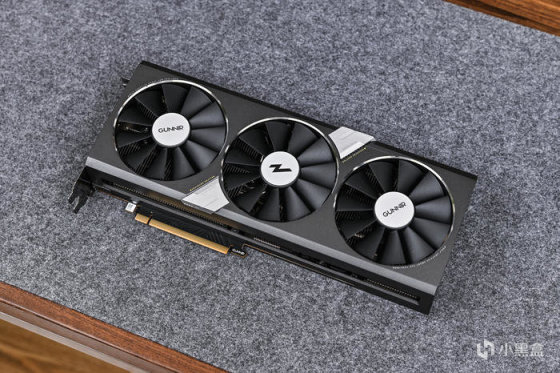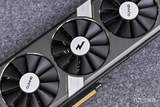 另一端是 GUNNIR 三角形 LOGO,当显卡正常运行是侧面的Logo灯效会开启并呼吸闪烁,同时它还具有检测电源和主板的作用,当显卡供电不足或异常时也会切换为黄色或红色作为警报灯。