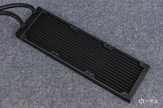 全黑化 360 铝制冷排。尺寸为:399.5x120x30mm,水道数量为12道,鳍片密度较高。