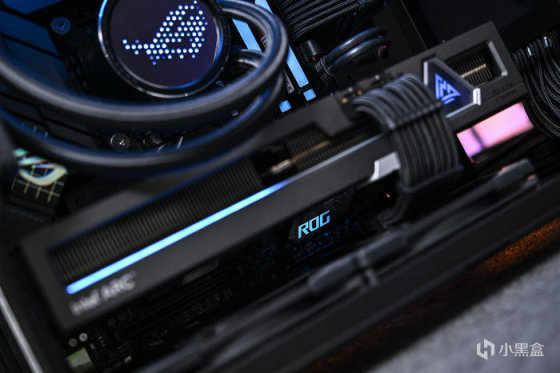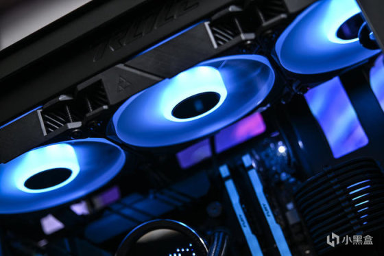 顶部冷排上的 3 把 ROG ARGB 连叶风扇灯效。