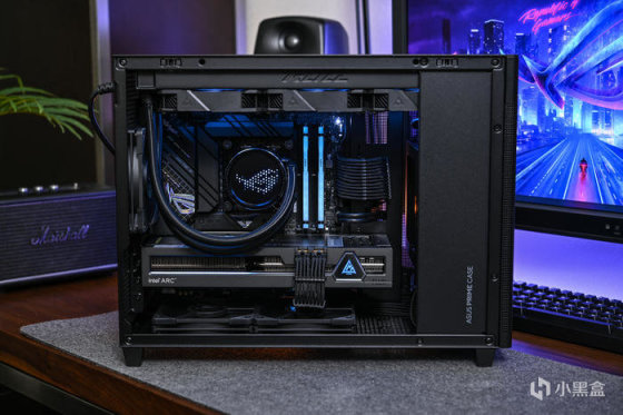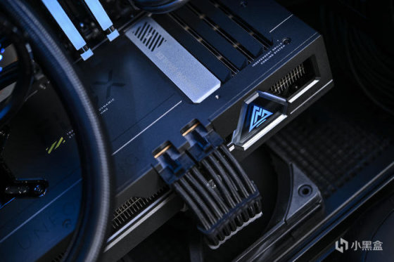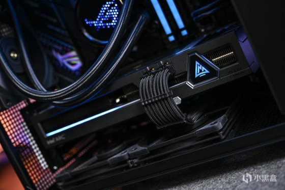 整机黑色调,为呼应蓝戟 GUNNIR Intel Arc A770 Flux 8G OC 使用深天蓝色 RGB 灯效点缀(R0,G40,B40)。