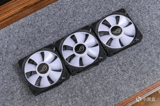 配备了 3 把 ROG 自家 ARGB 风扇。轴心处ROG Logo 采用了金属高光倒角处理,扇叶采用了乳白色的半透光扇叶,连叶设计,四角的螺丝孔正反面均配备减震垫。标称最大转速 2200RPM,最大风压 3.88mmH2O,最大风量70.07CFM。