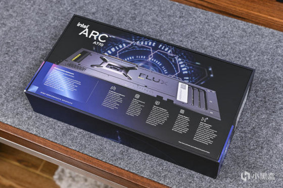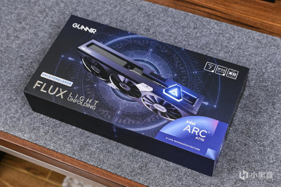 显卡是这次装机的主角,来自蓝戟 GUNNIR Intel Arc A770 Flux 8G OC。包装采用蓝黑主色调,包装中央是显卡正侧面渲染图,左上角是蓝戟的Logo,组下角印有 FLUX LIGHT 型号及英特尔首家合作伙伴字样,右上角标注了支持DX12 Ultimate、XeSS超级采样等特性,右下角则是 Intel ARC A770 授权标识。