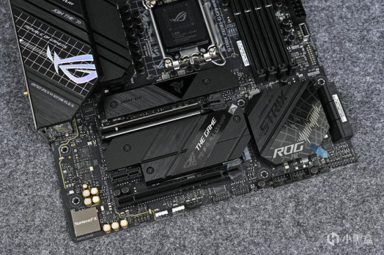 提供了 3 个 PCI-E 4.0x4 规格的 M.2 接口,可容纳 M.2 2242-2280 长度的 SSD 安装。同时配备一个 PCI-E 5.0x16 插槽(X16)和一个 PCI-E 4.0x16插槽(X4)以及一个 PCI-E 3.0x1 插槽。南桥散热模块上的 ROG Logo 镂空字体在通电时可显示 RGB 幻彩灯效。