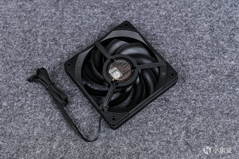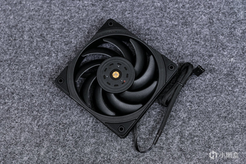 外观通体黑色,涡轮扇叶,四角都有缓震橡胶,同时采用动平衡点胶 2.0 工艺,实现 XYZ 三次元动平衡校正。框架是三角对称式设计,增加 23% 有效出风面积,提升 20% 结构受压强度。