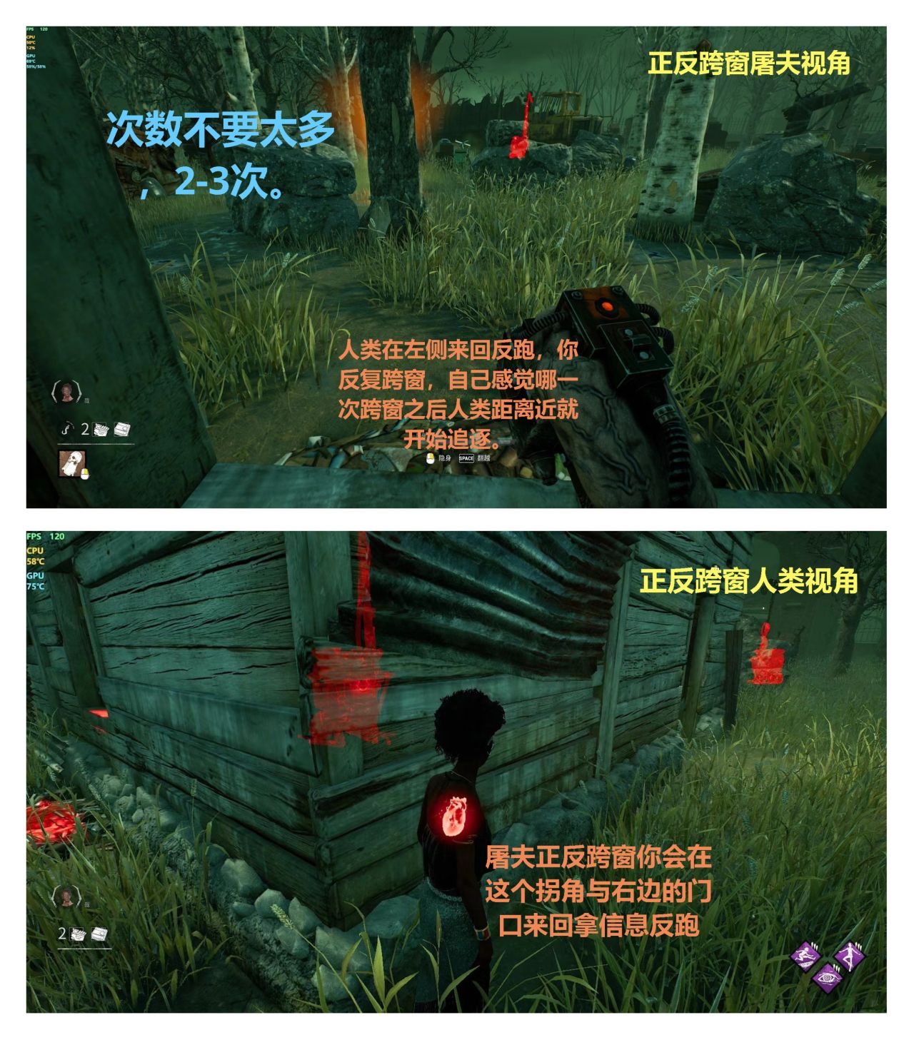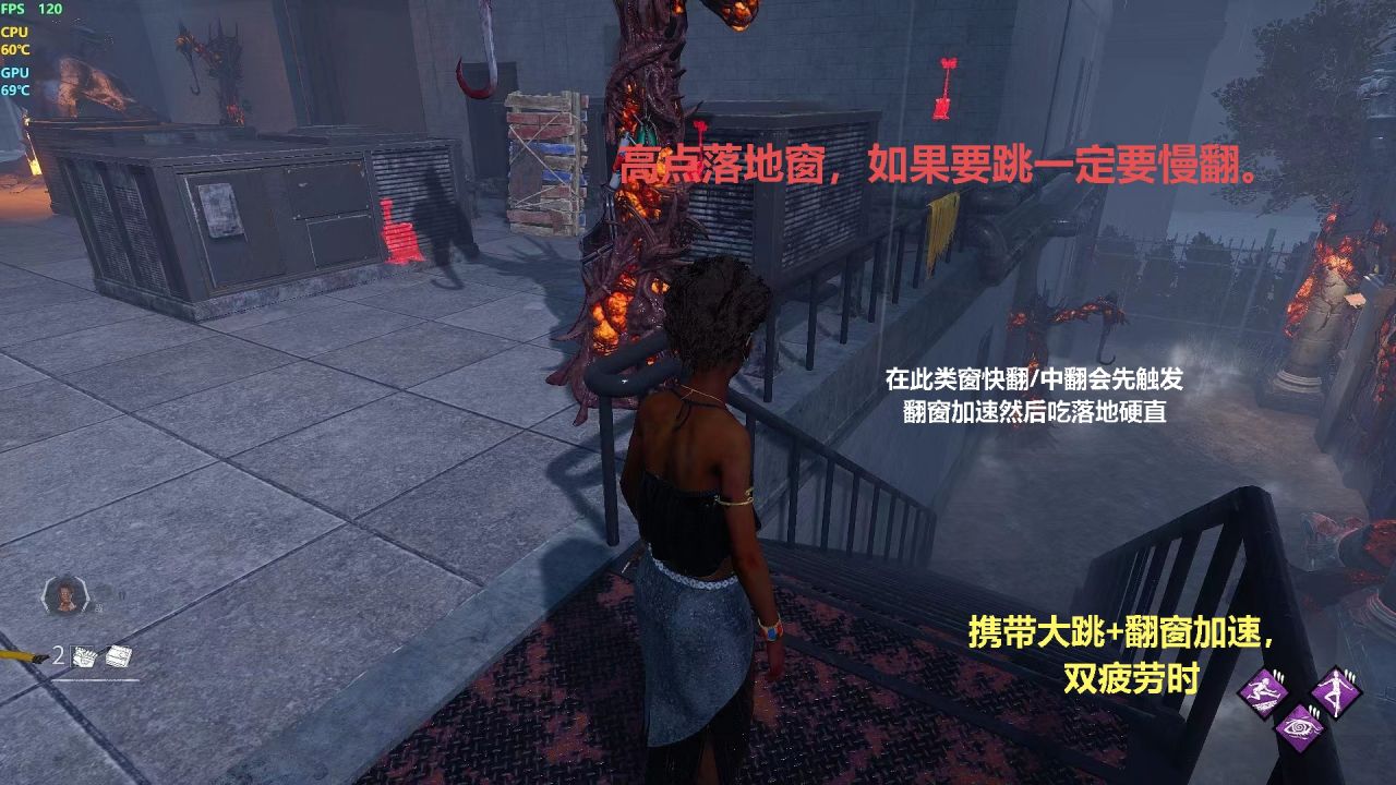 窗彈+大跳/鋼筋+大跳/即興表演+鋼筋,同時搭配守夜人效果好一點,如果是翻窗加速和大跳帶的話,在翻高處窗戶落地時一定要慢翻,不然會觸發翻窗加速同時落地硬質白喫一刀。