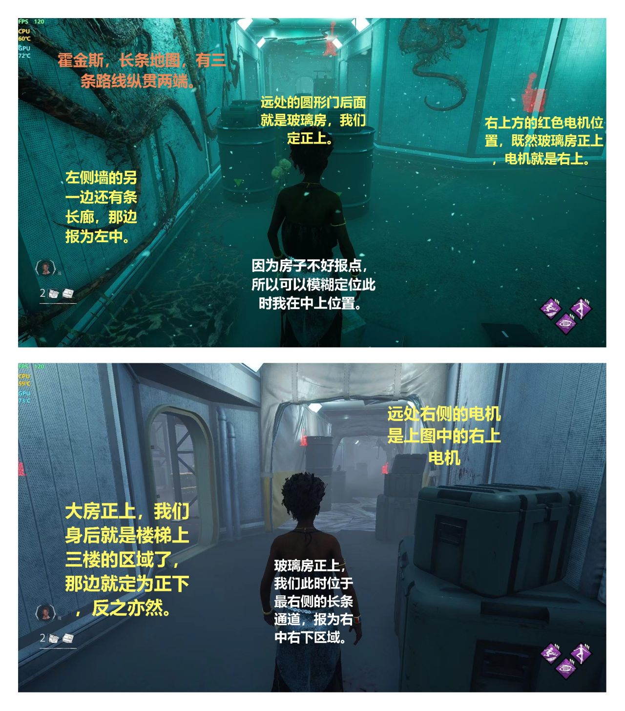 1) 隨着時間的積累一定要學會把地圖以平面圖方法來報點(類似FPS遊戲中的雷達形式),殺機目前最常用的報點就是大房爲主,白房爲輔(室內圖除外),報信息,例:你可能經常會聽到XX正上,我在左下或者屠夫在哪/屠夫追我,左上帶左下,都是在這一項基礎之上報的。