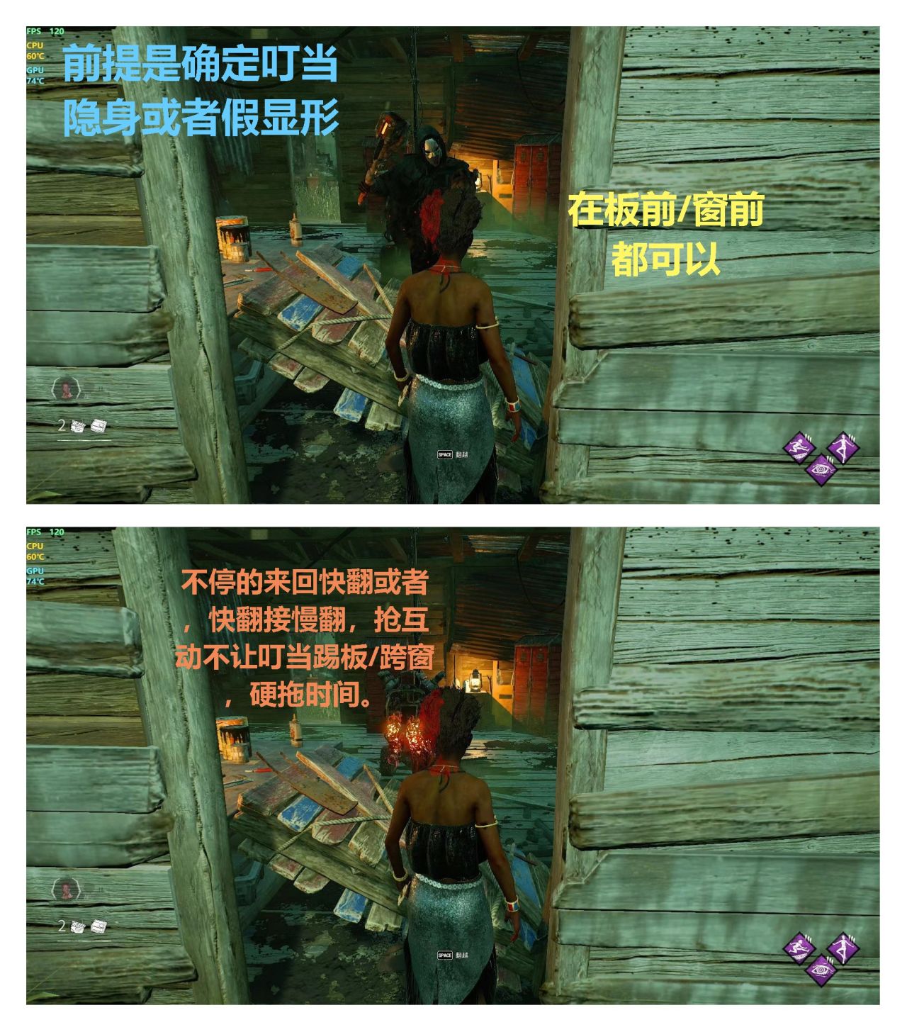 不停來回快翻或者快翻接慢翻(隱身狀態下沒追逐所以手速快就行),這樣屬於搶互動硬拖時間,但是一旦失敗基本會喫一刀