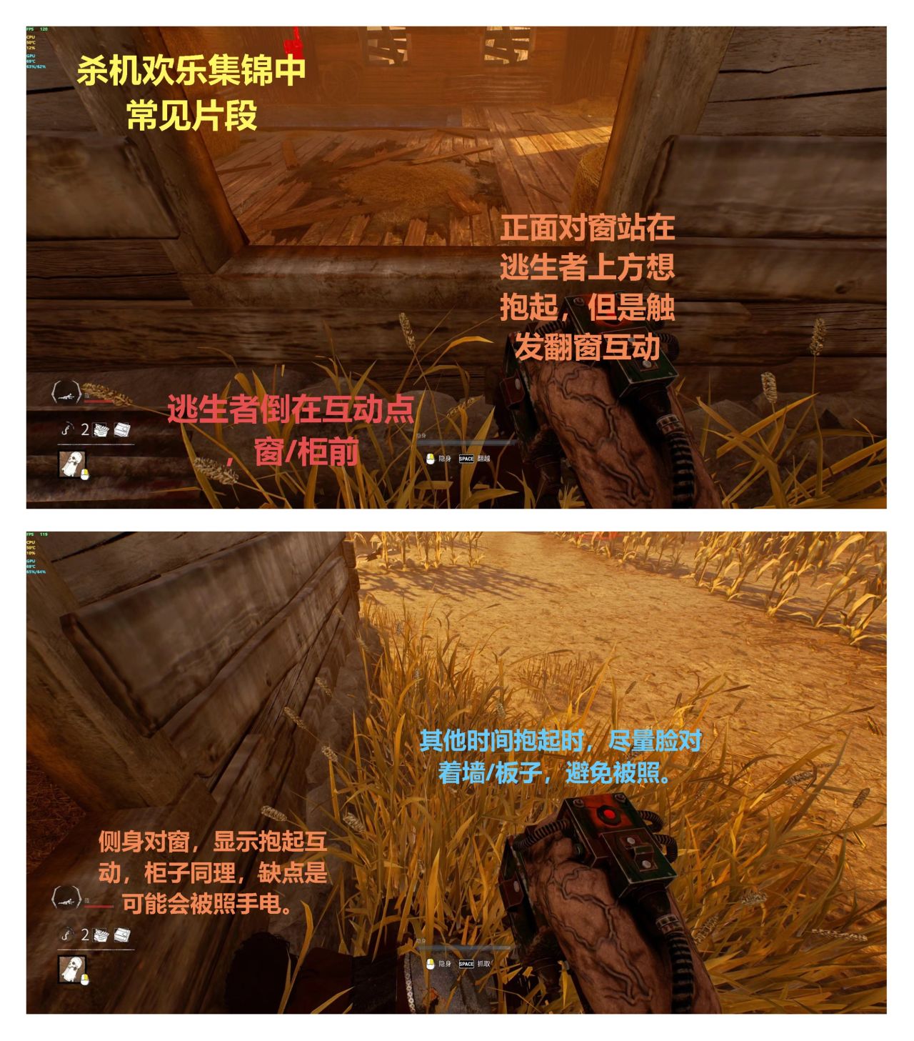 殺機正面蓋板有無敵幀,你可以從很多人的視頻裏看到,即便屠夫已經揮着武器要進板位,但是仍舊能被人類正面下板強制把屠夫蓋回去,一般人類會提前蹲下藏板後再蓋。