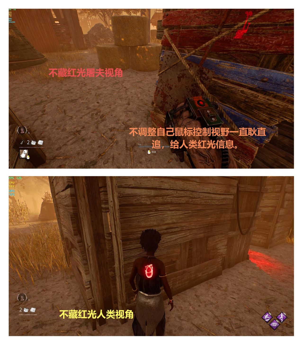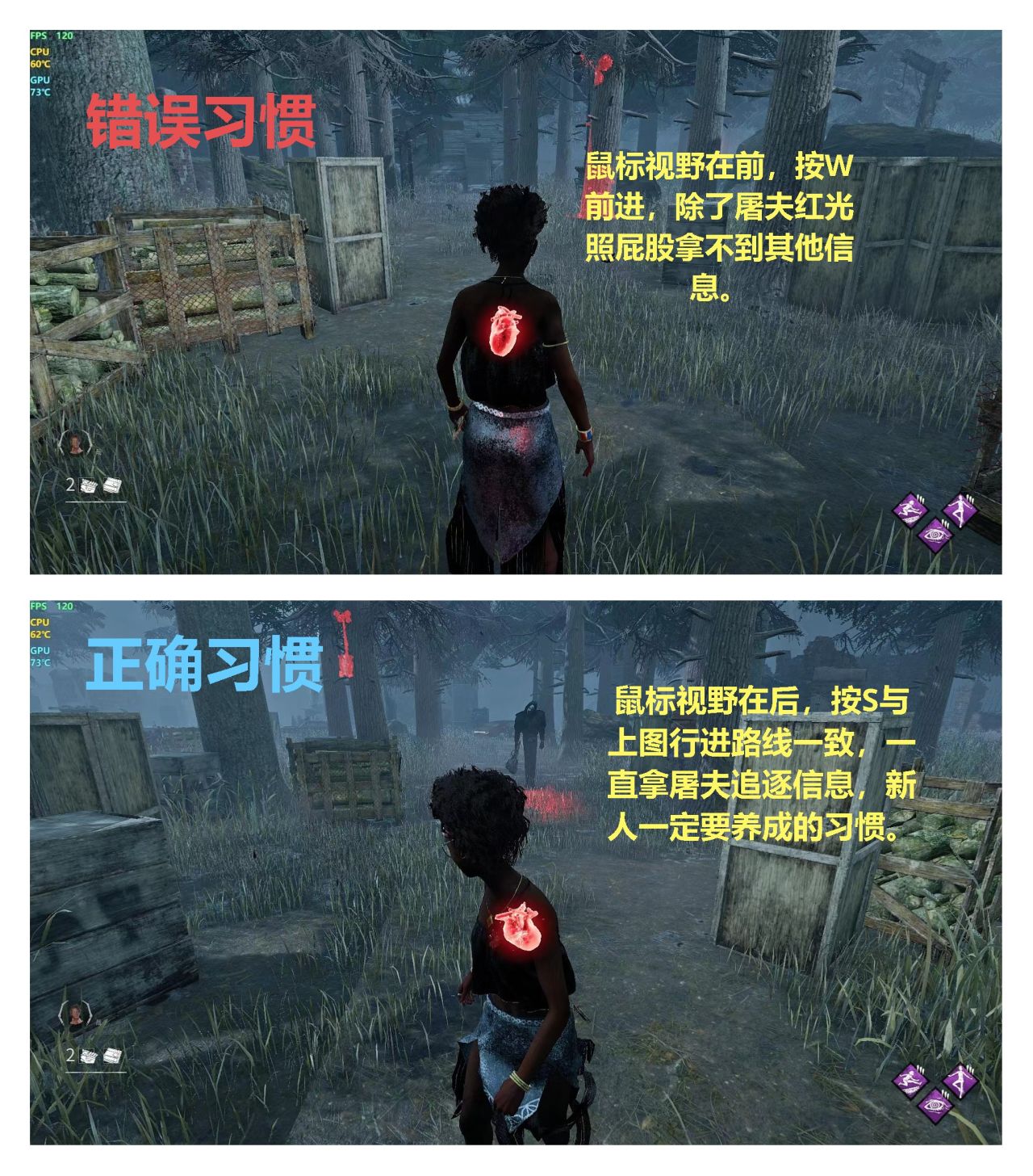 這一點真的非常非常重要,在****裏上路人車有時候也能碰到個別時長已經是很高但是溜鬼只看前面,被屠夫追上純看自己屁股有沒有被殺手紅光照上,前面聊過殺機的DPI,人類儘量要高一點,因爲不停需要拉視野+貼膜,最開始養成習慣最好,如果你是鼠標正前方+shift+w向前跑,你就要練習鼠標把視野拉到屁股+shift+s移動,與前一個操作行進路線相同,但是你能不停拿到身後追你的殺手信息。
