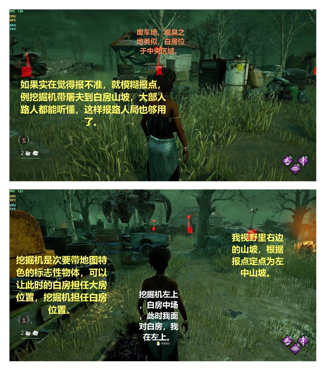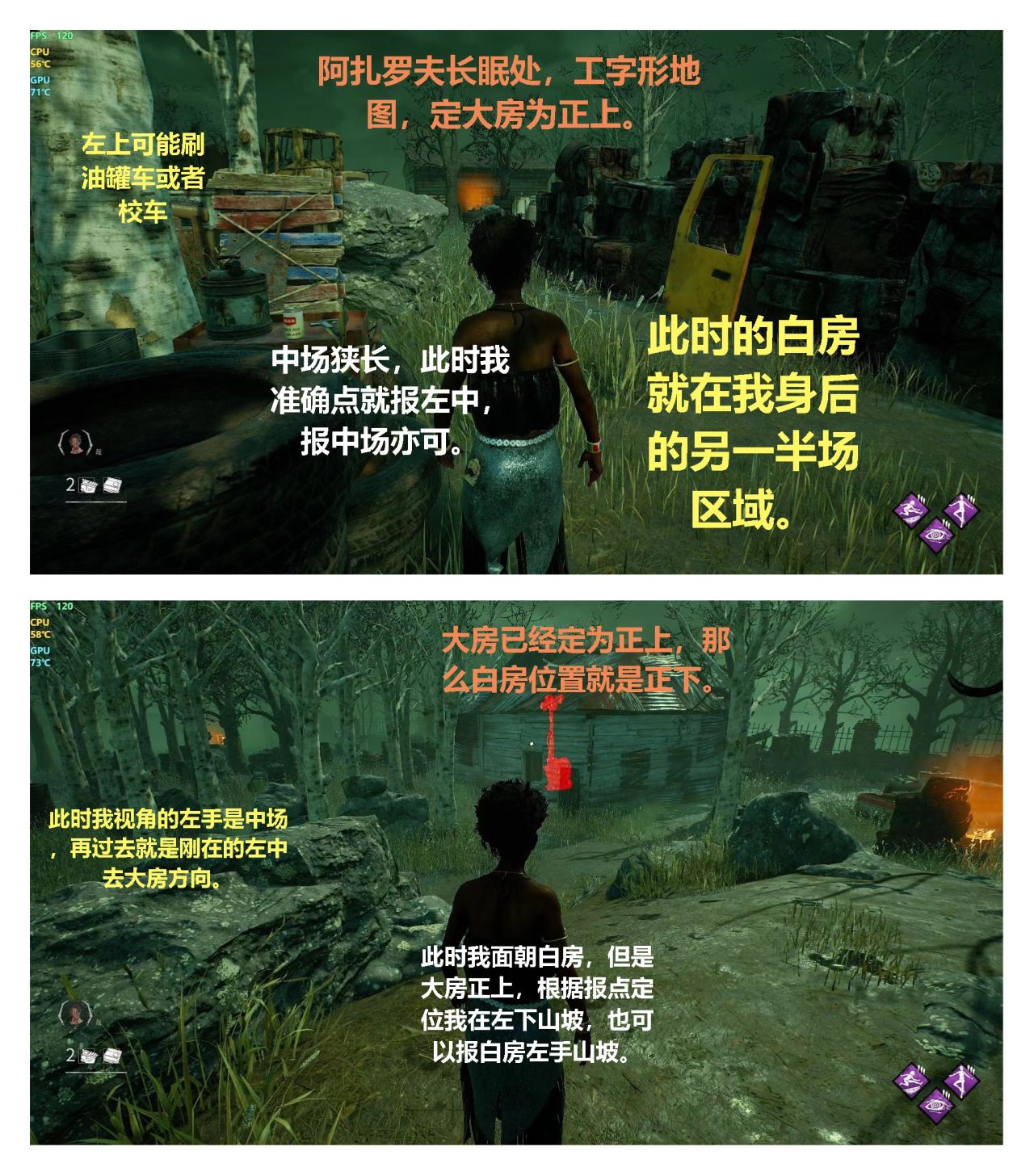 把白房當成大房,用輔助標誌性建築當作白房報點,腐臭的牛樹/車庫的校車,作爲替代地標肯定也要是該地圖獨一無二同時好辨認方位的。