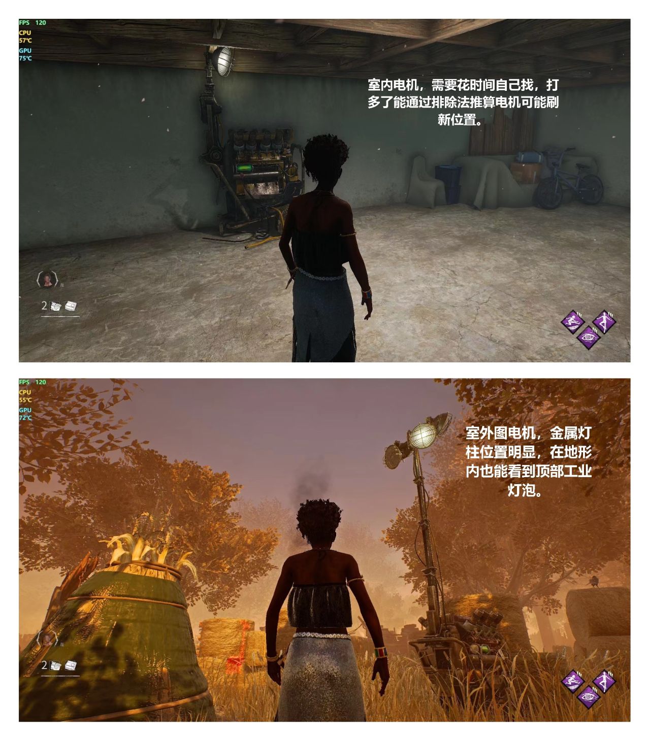 室外圖好說,電機會有一根戳天的金屬柱子加微弱閃爍的射燈來提示你電機位置,室內圖只會有單個的電機在房間裏(不過大部分都是固定刷的),讓人頭疼的是療程教室和小學這兩張圖的電機,療養院電機會有房間門口的閃爍燈牌指示,小學的電機語音車隊報點纔好找一些。