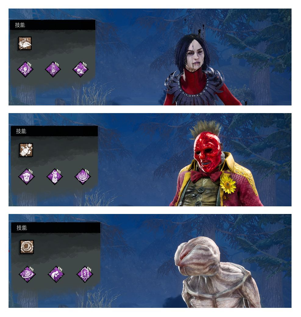 7.4 選取一個自己覺得適合自己的殺手去精進技術,殺手強度我之前做過排名,不過當前版本老排名中的連體嬰應該上升名次/下版本測試服如果實裝威斯克就排名肯定會下降,在基礎走地熟悉之後,我推薦大部分人在釘子頭/小丑/異形/瘟疫/騙術師/未知惡物挑一個玩(除非你就想玩幻神,或者就想玩輪椅白骨),釘子頭跟異形需要人類分出精力去解盒放炮臺,瘟疫倒逼人類喝水,小丑逼資源很強,騙術師打團很猛,未知惡物有全屠夫中強度最高的傳送,儘量選取理論上強度高一點的走地去玩,能讓你血壓可能不會太高。