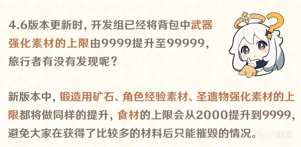 在4.7版本中,除了有体力上限提升这个重大更新外,还对玩家的锻造用矿石、角色经验素材、圣遗物强化素材以及食材的上限都做了提升。这个改动对于很多原神玩家来说,同样很重要。