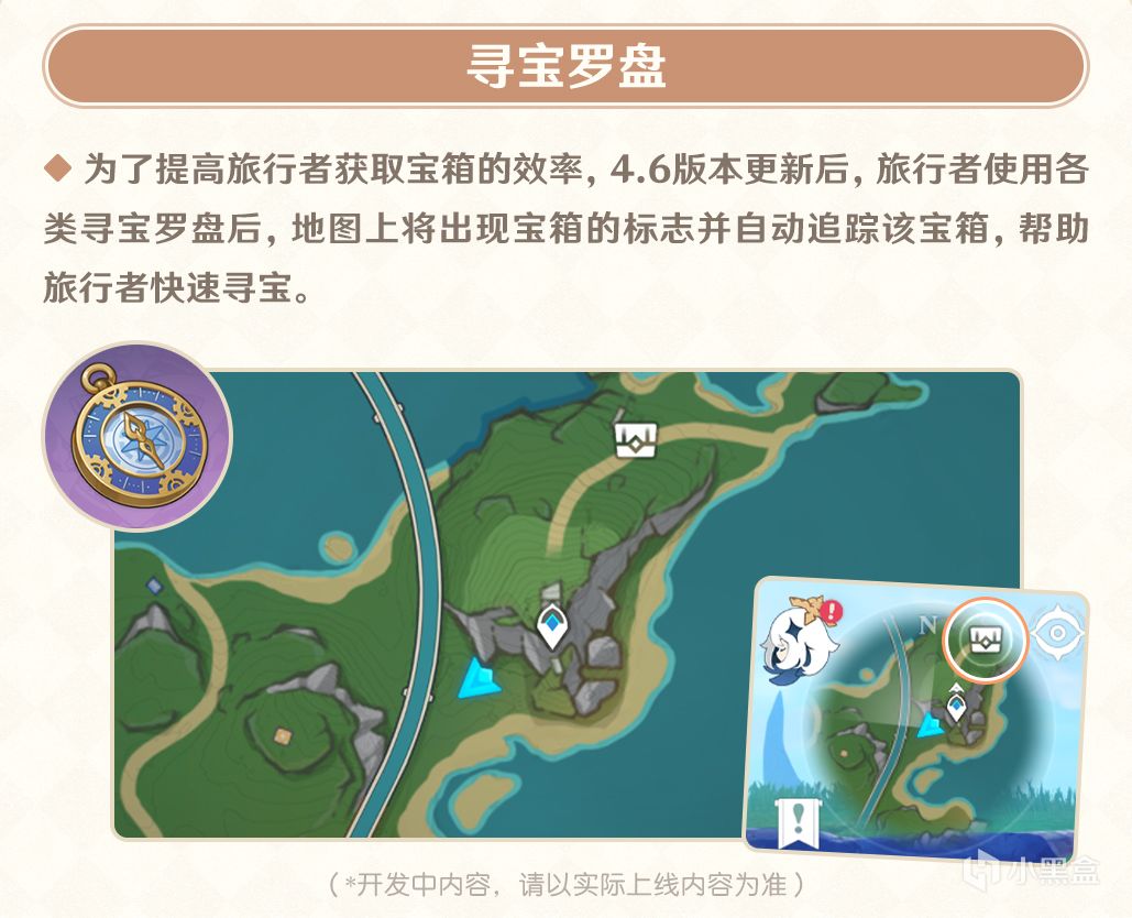 说起来,这几个版本米哈游在优化玩家游戏体验上,也是下足了功夫。在4.6版本,制作组就优化了一波寻宝罗盘。玩家在使用罗盘后,地图上不仅会出现宝箱标志,还将自动追踪该宝箱,当玩家打开该宝箱后,罗盘还会自动刷新冷却时间。这个改动让玩家们在探索大世界时,有了更可靠的工具,收集宝箱也会更快。