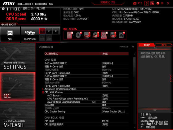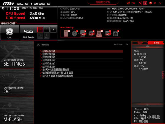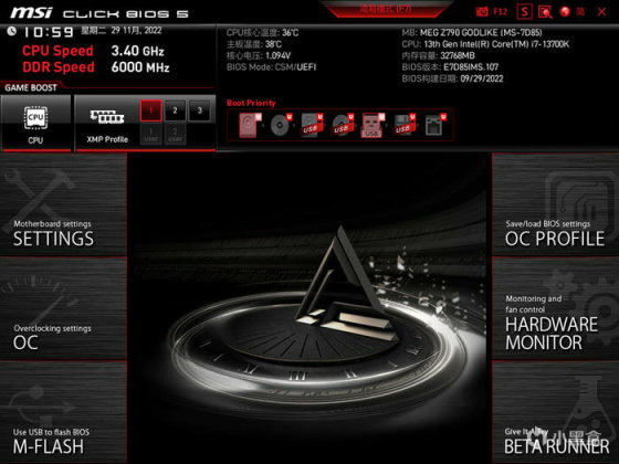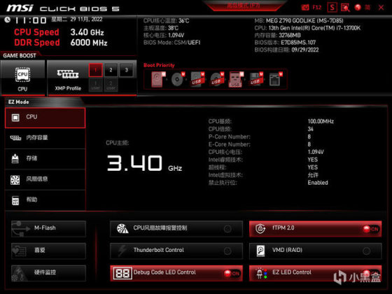 BIOS默认为EZ Mode,可进行一些快速调整,左上角可以进行 XMP/EXPO 内存一键超频,内存除了支持 XMP 3.0 技术以外,也对EXPO功能进行了兼容。