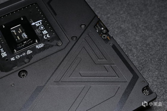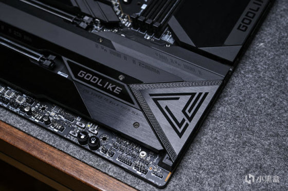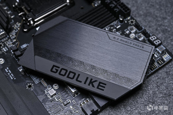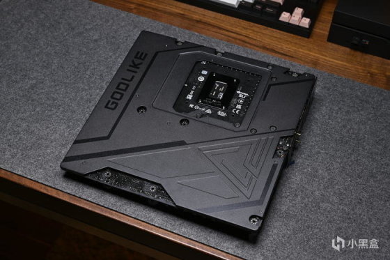 来看主板背面,整体被厚实的散热装甲覆盖,左侧印有 GOODLIKE 字样,右侧则辅以大量几何科技图案。