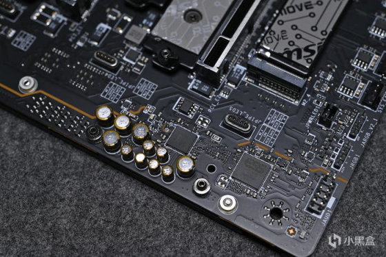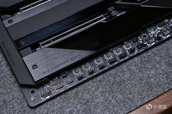 来看主板下方,通体覆盖的厚实的散热装甲,拉丝铝合金和镜面的艺术结合。双PCIe插槽,均有金属屏蔽罩包裹,保证接口强度及视频信号稳定抗干扰,其中第一条支持 PCIe 5.0x16,第二条支持 PCIe 5.0x8。