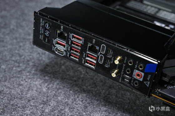 主板I/O接口方面非常丰富。从左到右分别为:1x清除 CMOS 按钮、1x闪存 BIOS 按钮、1x智能按钮、1x2.5G 局域网接口、1xUSB 3.2 Gen 2 10Gbps (Type-C)、7xUSB 3.2 Gen 2 10Gbps(A型)、1x10G 超级局域网接口、2xThunderbolt 4 40Gbps (Type-C)、2x迷你DP显示端口输入(用于雷雳直通)、2xWiFi 6E 无线/蓝牙天线、5合一3.5mm音频接口、1x光学 S/PDIF 输出接口。