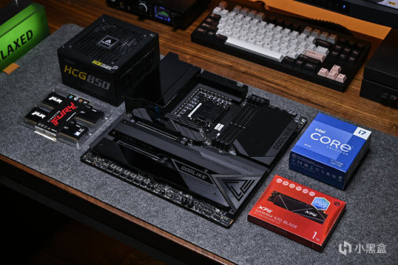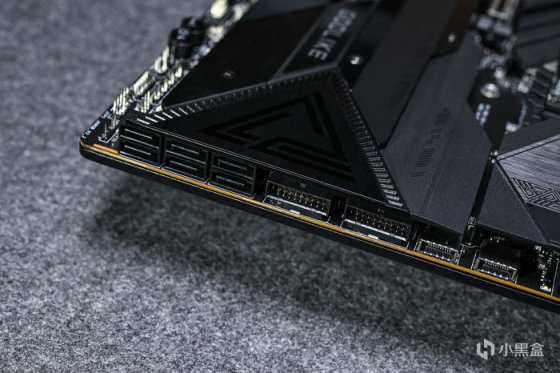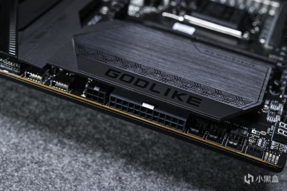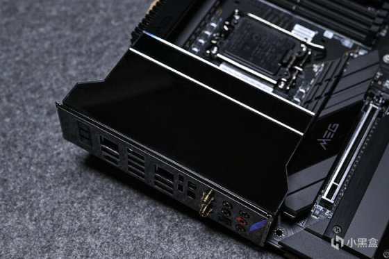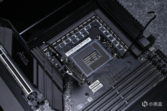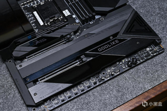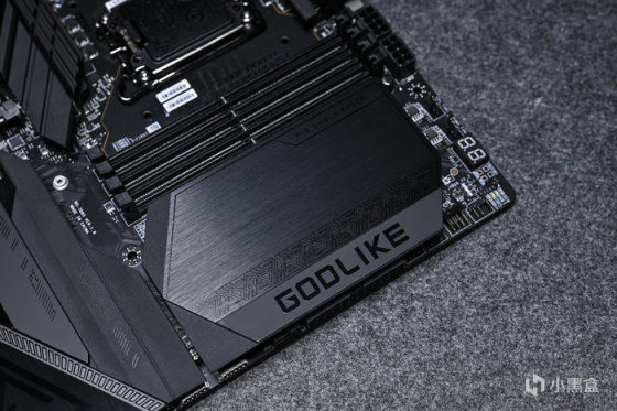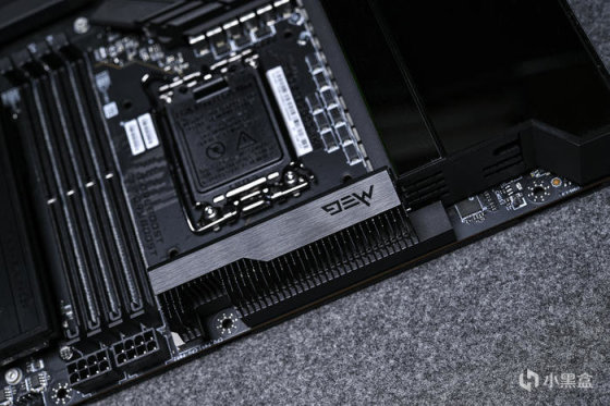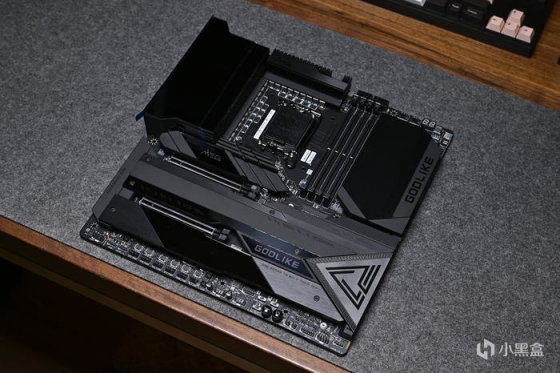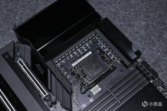 取出主板本体,E-ATX 超大版型,尺寸为 304.8mmx310mm,主板整体为黑色,表面覆盖有大量铝合金拉丝散热装甲和镜面装饰,波浪形散热片设计、直接触摸交叉热管、铝盖、波纹状鳍片散热器增加了表面积以实现更高的散热能力,而交叉散热片则能成功地将主板 VRM 产生的热量带走,从而实现更好的冷却效果。