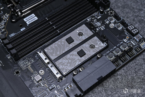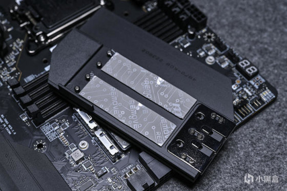 盖板为快拆式设计,轻按顶部即可快速移除盖板,实现 M.2 SSD 的快速拆装。下方两个M.2 插槽支持 PCIe 4.0 2280 SSD 接入,下方预贴了 7W/mK 导热垫。