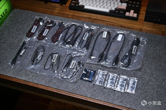 线材附件方面是非常丰富的,3 根黑红相间编制 SATA6 数据线,2 根温控线、1 根一分三 ARGB线、1 根一分二 ARGB 线、1 根 ARGB 延长线、2 根DP to Mini DP视频线、1 根前面板控制接口辅助插针线、1 个驱动 U 盘、M.2 快拆螺扣若干等。