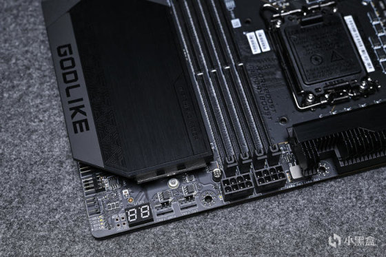 内存方面四根支持 DDR5 内存插槽,单边快拆扣设计,支持最高 128G 双通道 DDR5 7800+MHz (XMP/EXPO超频),双8-pin CPU电源接口。最左边有 DEBUG 纠错指示器,4 组简易电压测量点。