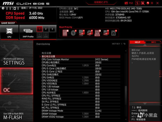 OC 超频设置页面。可以调整相关CPU,内存等核心设备的电压以及频率,可选普通和专家模式。