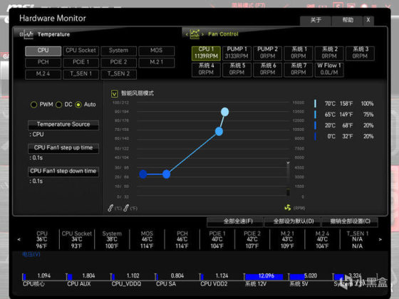 依然是微星的图形化风扇调速界面,每个接口都可以单独设定调整温度来源以及风扇曲线。
