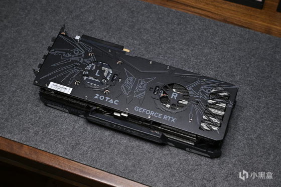 显卡背面采用黑色合金背板,为显卡内部 PCB 提供防撞、防静电保障。背板部分也提供了两枚可拆卸、通过触点和卡扣安装的 RGB 风扇,一个负责吹风、一个负责抽风,帮助显卡整体风流更顺畅,散热更出色。同时,风扇配合背板上的天启之翼图案,共同组成了会发光的完整天启之翼 2.0。