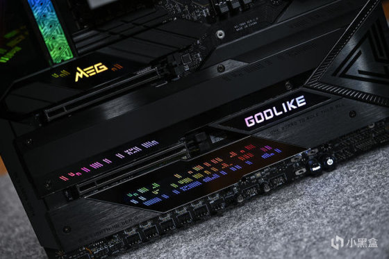 主板南桥散热片上的 GOOKLIKE 字样具备 RGB 灯效,右侧是 MEG 三角图腾。