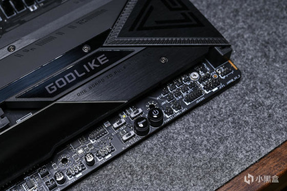 右侧具有独立开关机及重启键,1 个BIOS切换开关、1 个灯效切换开关以及 1 个M-VISON开关。大量的跳线开关,低温启动、清除BIOS、低模式、超频安全启动BIOS、超频重试等跳线一应俱全,方便玩家进行各类极限超频使用。