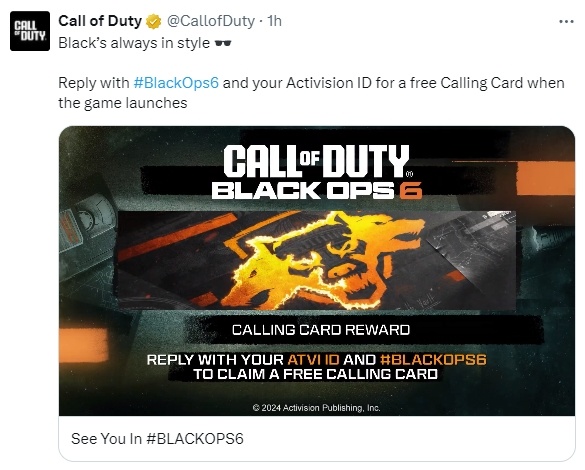 此外,在官方這條推特下帶着“#BlackOps6”回覆動視賬號,可在遊戲正式發佈後獲得一張動態名片。
