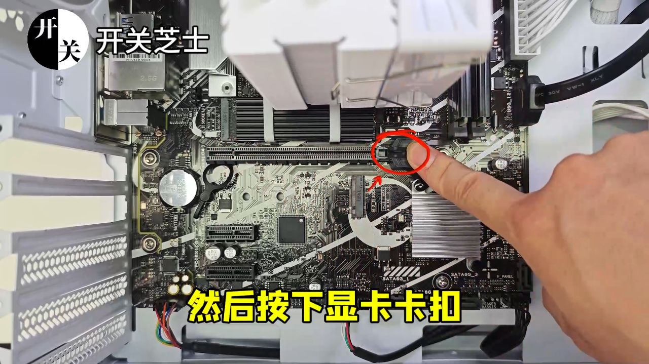 找到機箱主板最上方的顯卡插槽,然後按下顯卡卡扣: