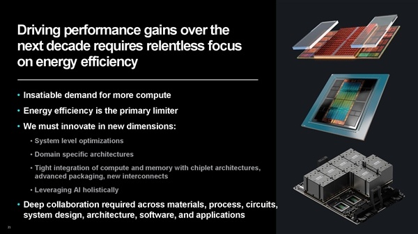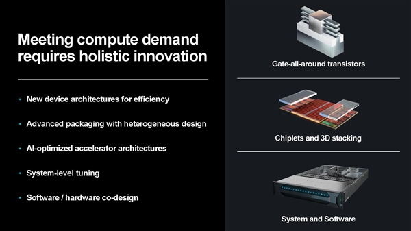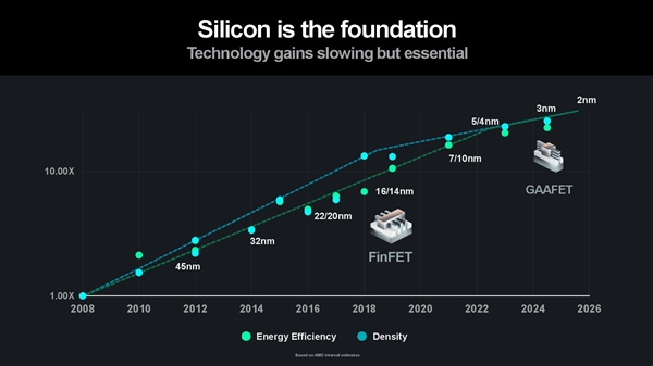 为此,AMD将多管齐下,从产品架构、制造工艺、封装技术、互连技术等方面提升能效,比如3nm GAA全环绕栅极工艺,比如2.5D/3D混合封装,等等。