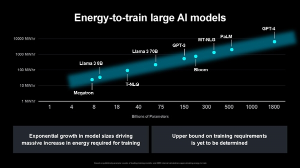 苏姿丰指出,眼下提升计算产品能效的最大障碍就是AI大模型训练、微调所需的庞大算力,往往离不开成千上万的GPU加速器,以及成千上万兆瓦的电力,而且还在急剧膨胀。