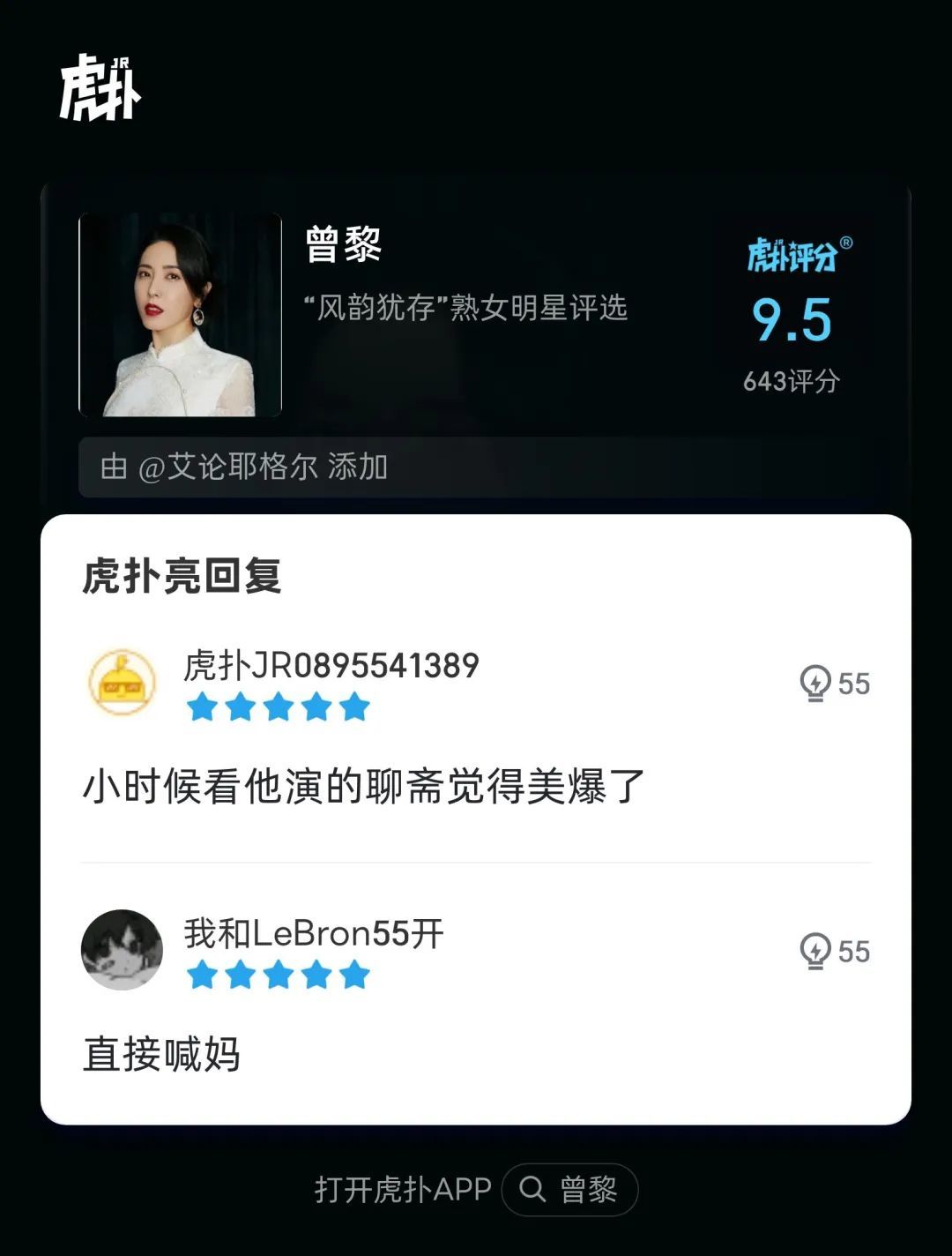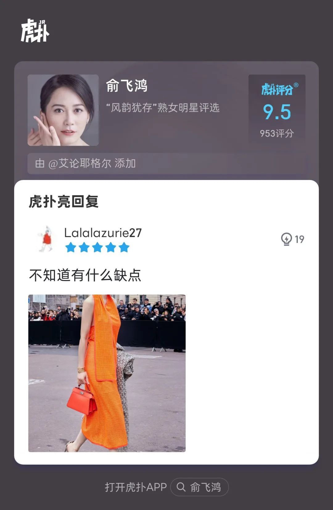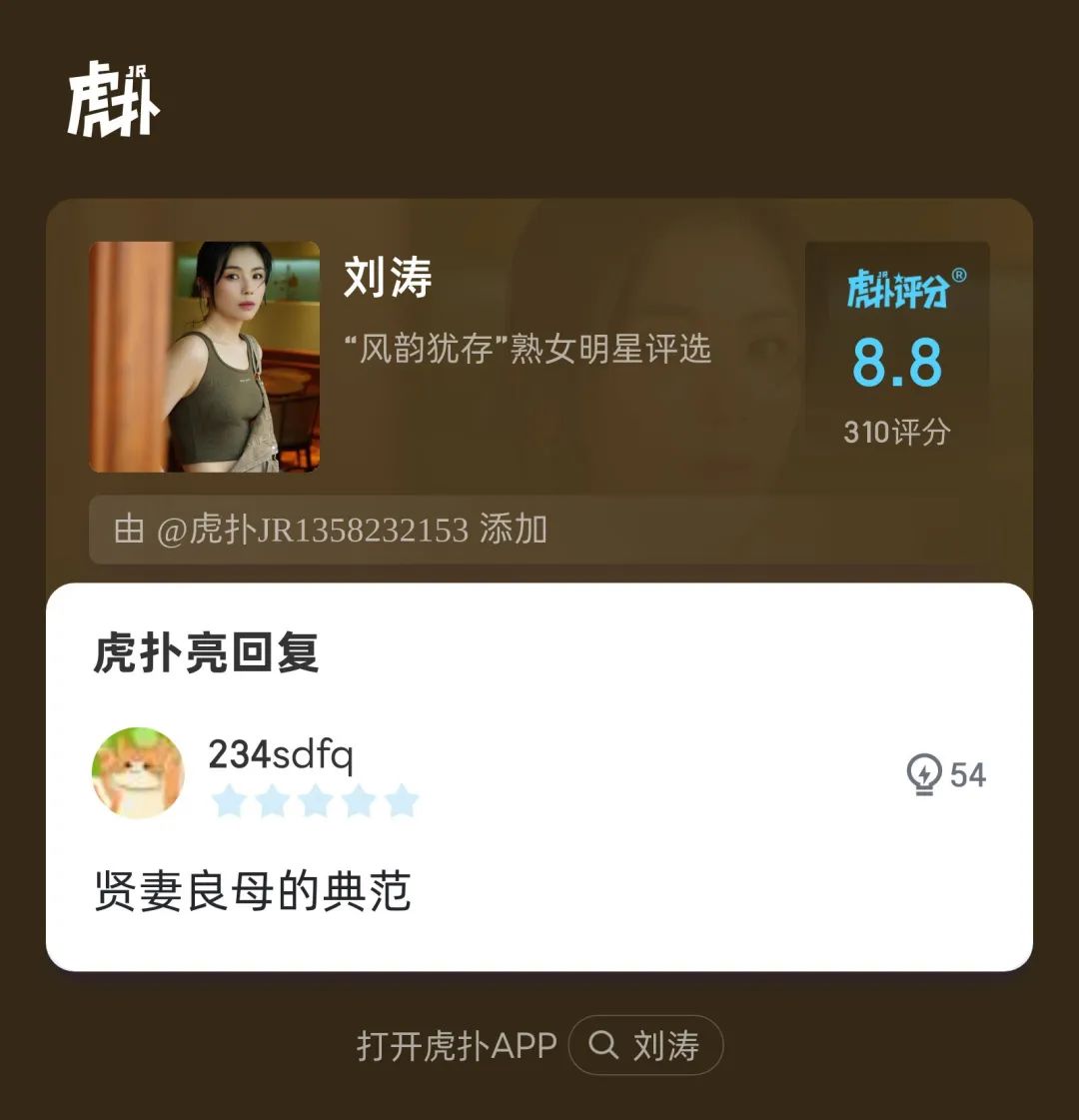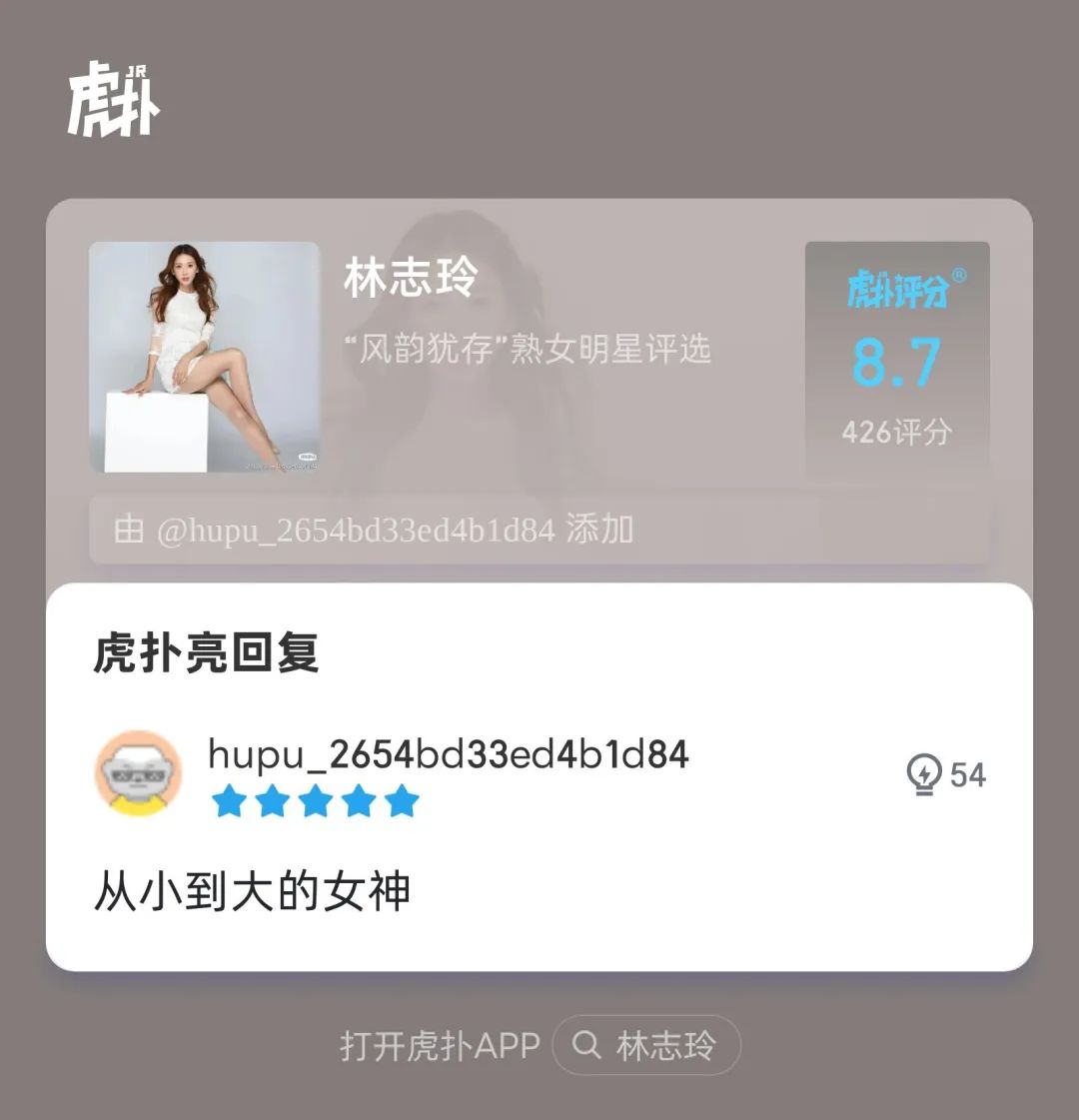 虎扑官方评语:“她52岁了!怎么会有人年龄和美丽成正比增长的!”