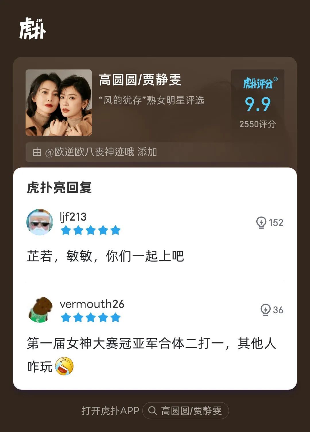 高圆圆和贾静雯都是中国内地的知名女演员,两人之间的友谊深厚,堪称娱乐圈的“闺蜜典范”。这对闺蜜一同登上了虎扑“风韵犹存”熟女明星评选榜榜首。