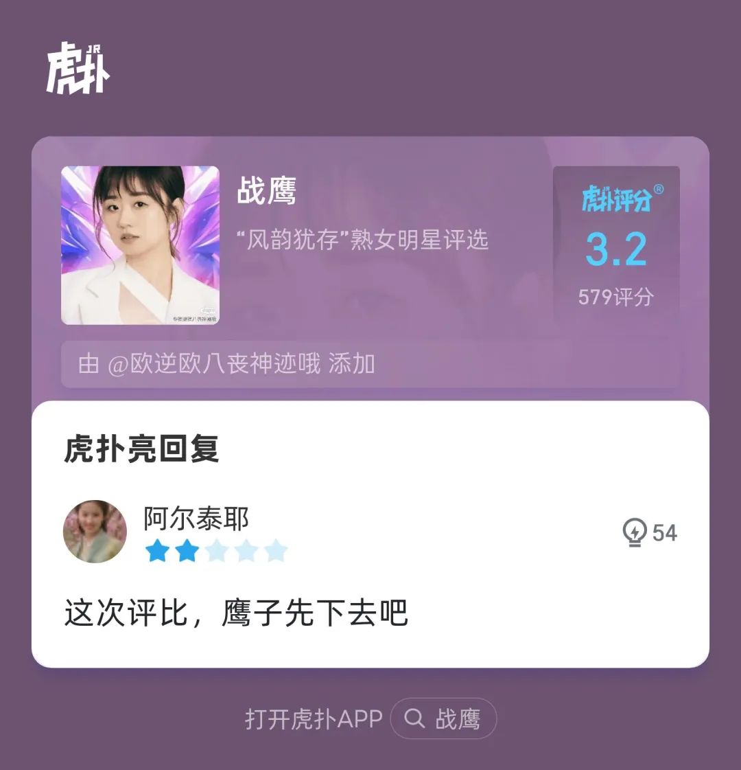 在虎扑,战鹰曾击败刘亦菲高圆圆佟丽娅娜扎,获第八届“虎扑女神”冠军。虎扑官方给出这个特别奖,只能说不愧是虎扑顶流!