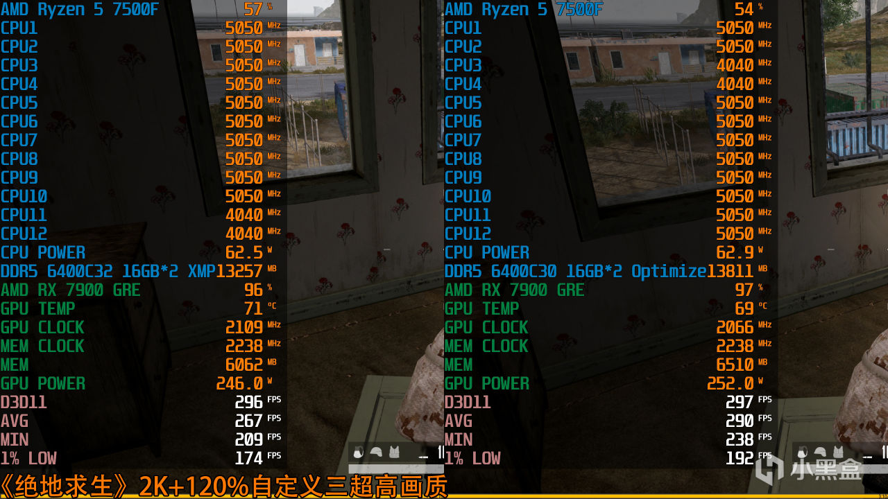 锐龙5 7500F+RX 7900 GRE《绝地求生》2K+120%自定义三超高画质实测,可以看到在DDR5 6400C30且小参优化情况下,相比XMP预设超频,游戏的平均帧数提高了8.6%,1% LOW帧数也提高了10.3%,相当于显卡性能的一个小等级提升了!
