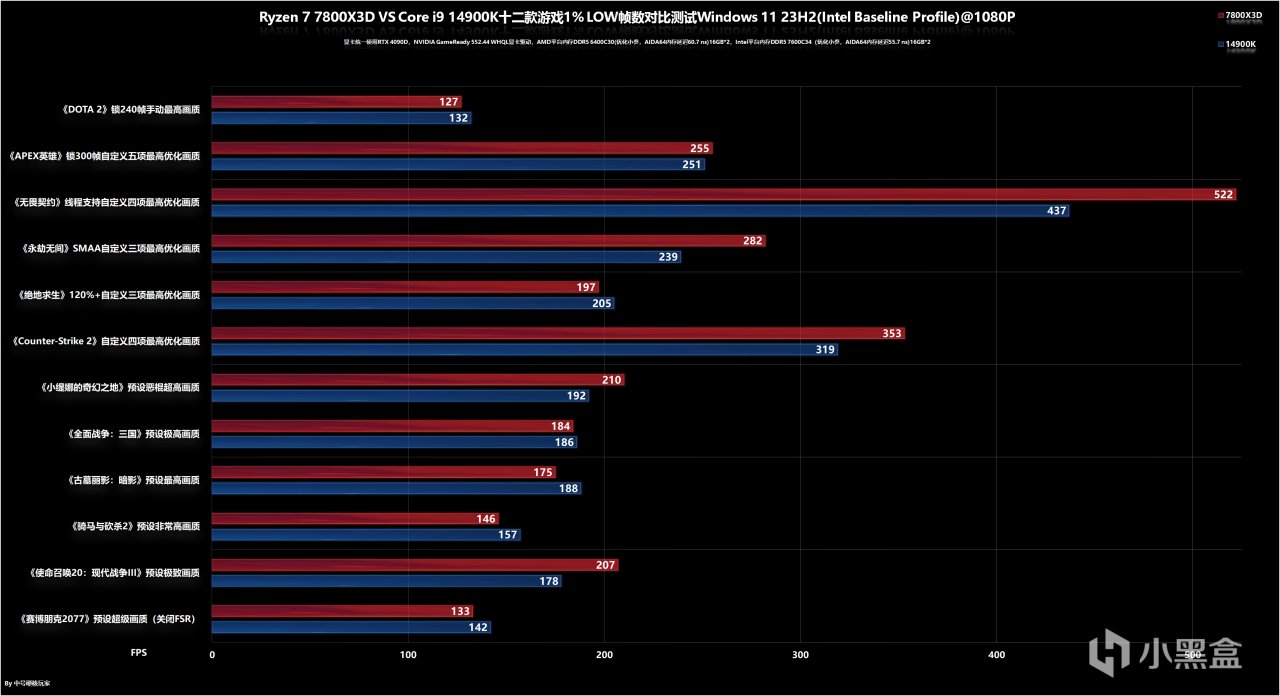 锐龙7 7800X3D VS 酷睿i9 14900K十二款游戏1% LOW帧数对比