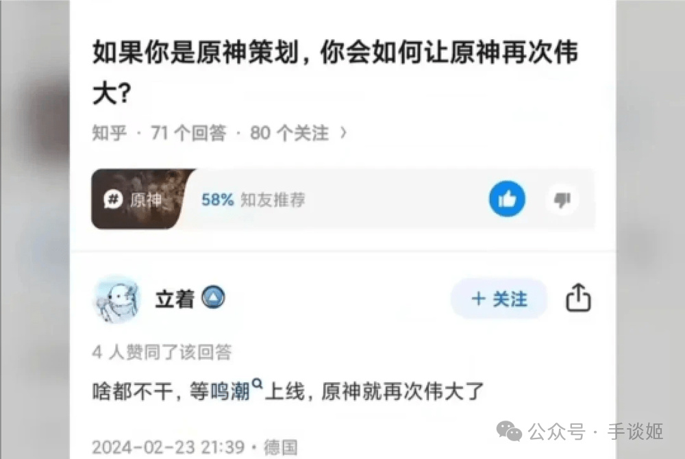 不过请注意,这样的失望也是基于和《原神》对比的,而不是和以三国为代表的抽卡换皮游戏对比的,手谈姬确实抱有了更多的期待,而《鸣潮》作为一款持续运营游戏,当然不能只看刚开服时候的评价。