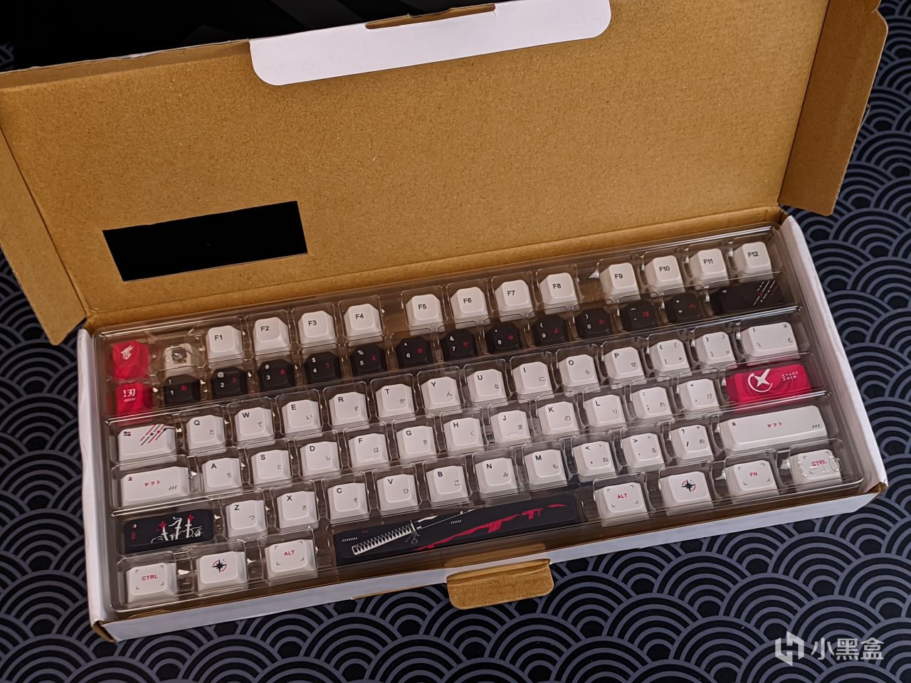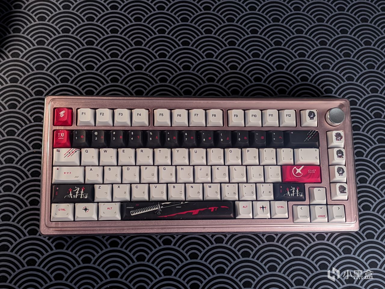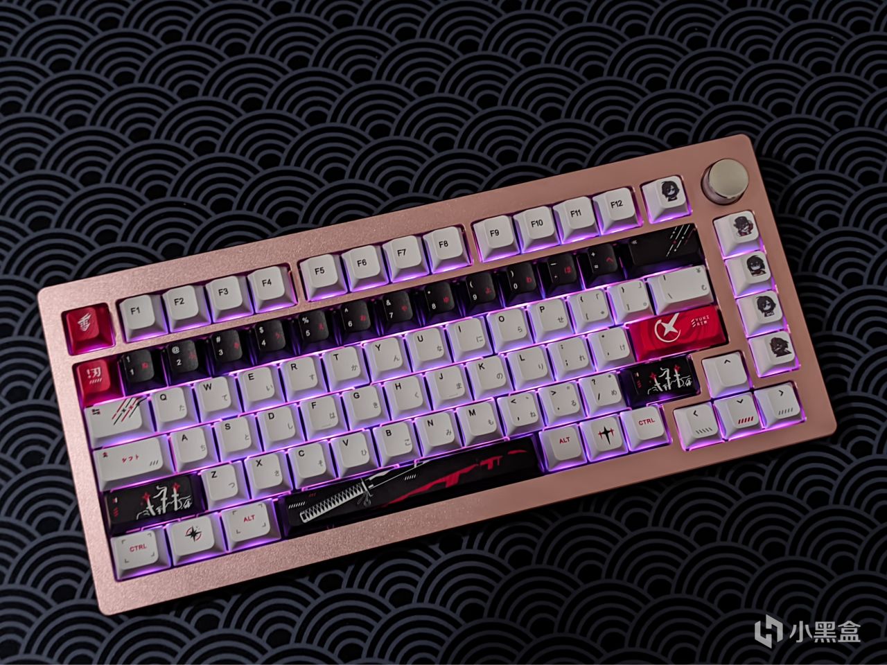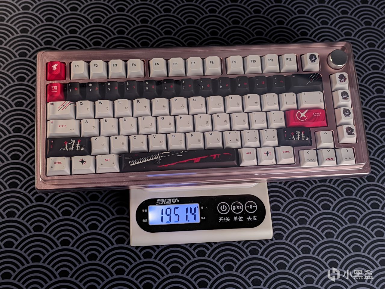 那轴体上完了,就得上键帽了,这款键帽是LEA工作室复刻的Yuki aim键帽,就是那款2199元的绝版磁轴键盘上面的键帽,其价格算是所有复刻中最便宜的,但质感倒是比我想象中的好不少,键帽摸起来比较顺滑干爽,且不容易打油,可以看出PBT的含量给的比较足,同时其本身的颜值我也很满意,不过比较可惜的是其只有93键,对于75配列倒是完全够用,但大配列应该就比较难了,同时例如Alice之类的小众配列应该也是不能使用的,所以感兴趣的老哥需要提前问清楚。