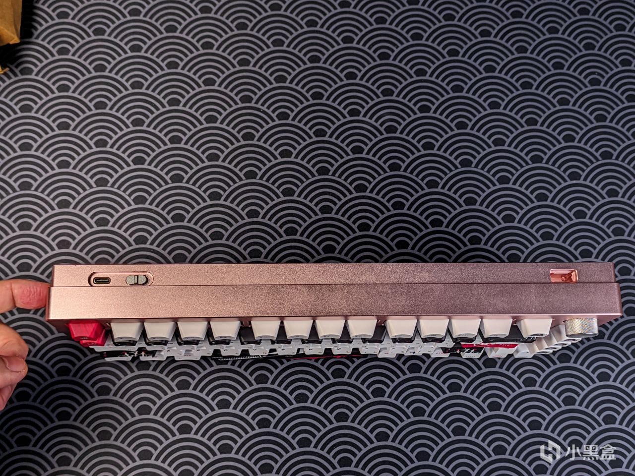 说回套件本身,其顶部有电源口以及开关键,同时右侧那边是接收器的收纳仓,内有一定的磁性,所以收纳起来不是很容易掉,还是比较放心的,就是不要用力去甩,不然还是有可能飞出去的,75v2并没有采用强磁性。