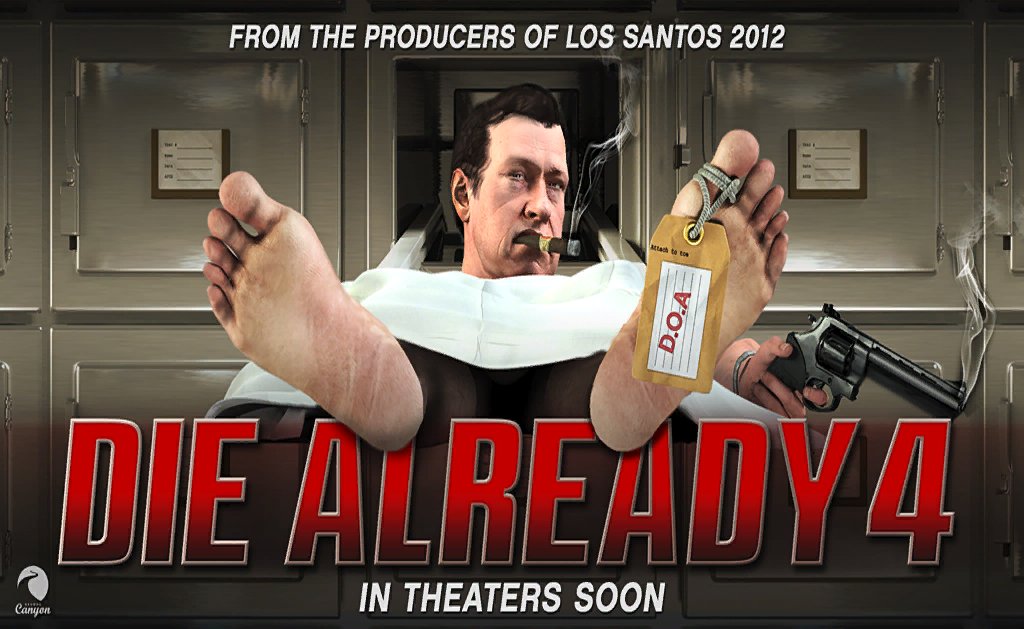 遊戲裏的電影廣告《Die Already 4》就是致敬了該系列,它是電影《洛聖都2012》製片人的新作。海報裏特工僞裝成屍體混進停屍房的橋段和遊戲裏麥克的【死裏逃生】任務如出一轍。