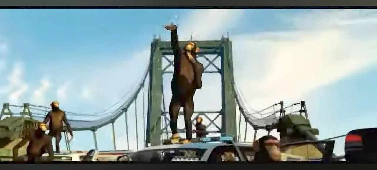 不過《猩球崛起》第一部其實發生在舊金山,HD宇宙不存在以此爲原型的城市。《猿猴》預告片中混合了來自前作IV自由城的鏡頭,但大部分還是在洛聖都拍攝的,米里亞姆特納高架橋*也客串了把金門大橋,可能人類已經失守了吧。