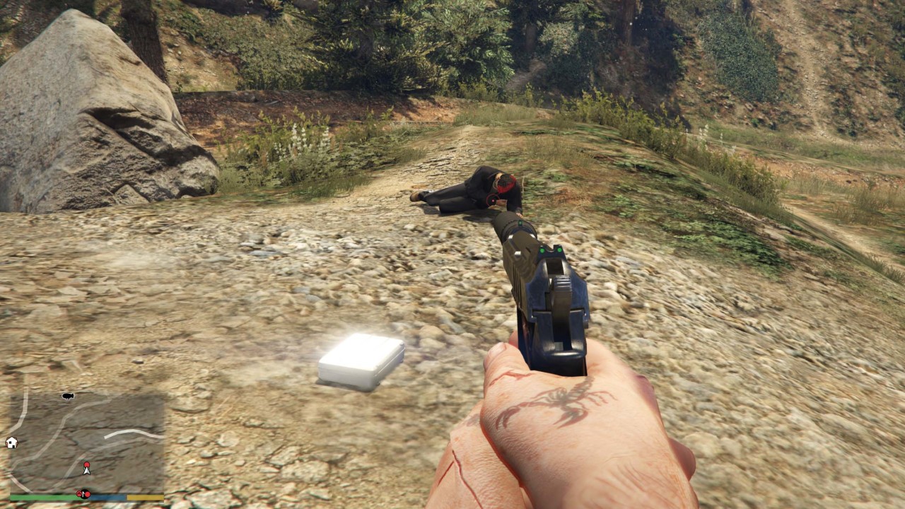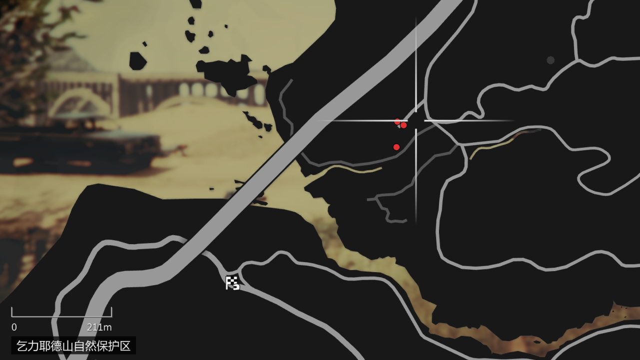 在乞力耶德山附近高速的山坡上,就有機會看到兩波讀飯交易火併後的兩敗俱傷的場面,還有奄奄一息的男子還會警告玩家“離東西遠點”。這裏幾乎完全復刻了電影開場的場景,R星連人帶車,甚至是狗的位置都還原了。“鉅款”公文包自然也在,不過裏面的鉅款被減少到了25000GTA$,撿起後會有一夥人追殺玩家。